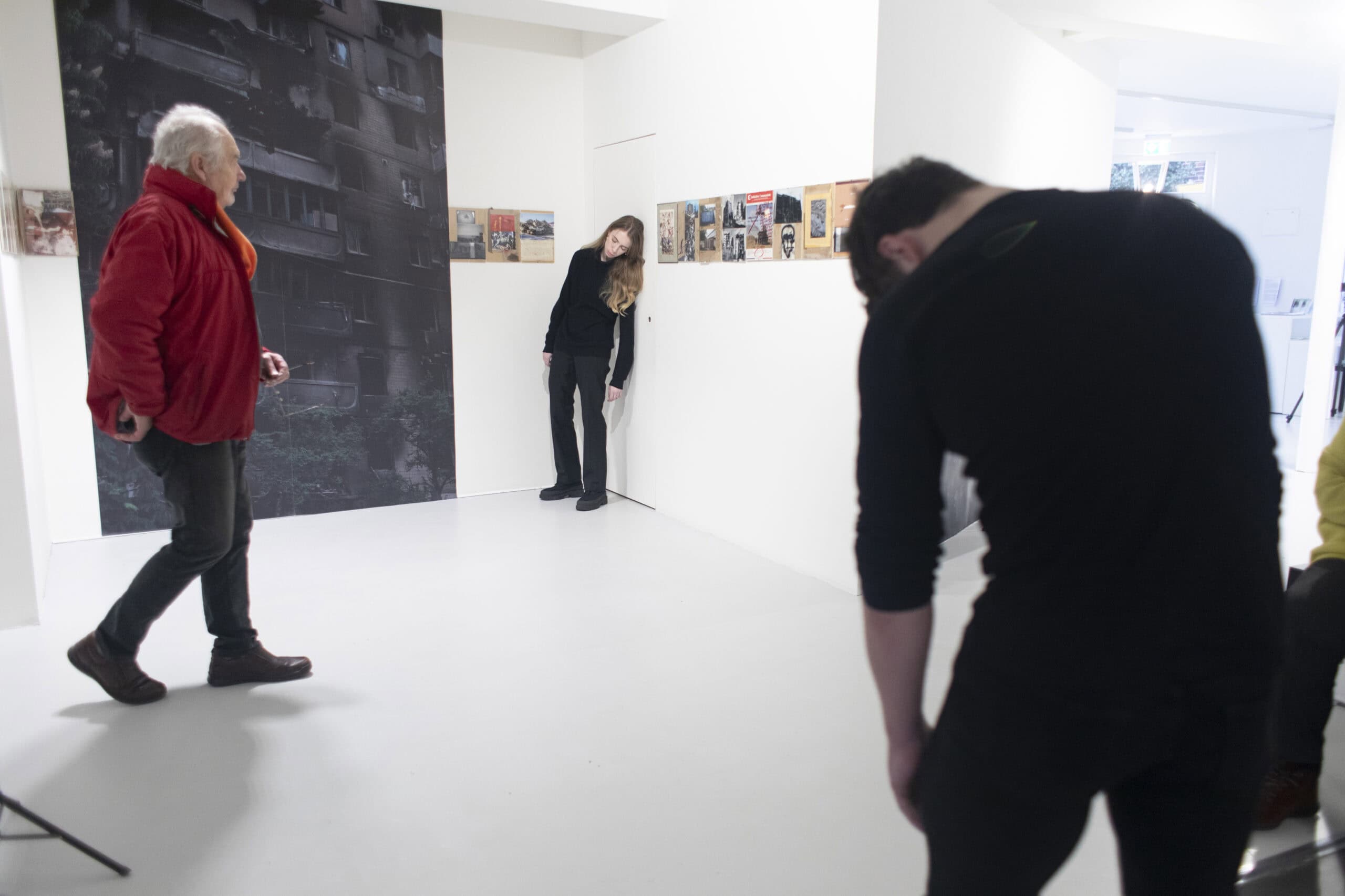 Ситуація триває тридцять, можливо, сорок хвилин — повільних хвилин, впродовж яких майже нічого не відбувається. Кілька людей у просторі, на перший погляд, стоять знерухомлені, статичні. Ви б і не одразу помітили їх, якби прийшли на виставку Contemplating the Empathy of Others у Stadtgalerie Künstlerhaus Lauenburg, не знаючи про ситуацію. Проте ця нерухомість оманлива. Кілька перформерів, що губляться серед глядачів, рухаються плавно і повільно, з усією фізичною виснажливістю та складністю, якої вимагає контрольований рух тіла, що в моменті виглядає природним «сповзанням» додолу.