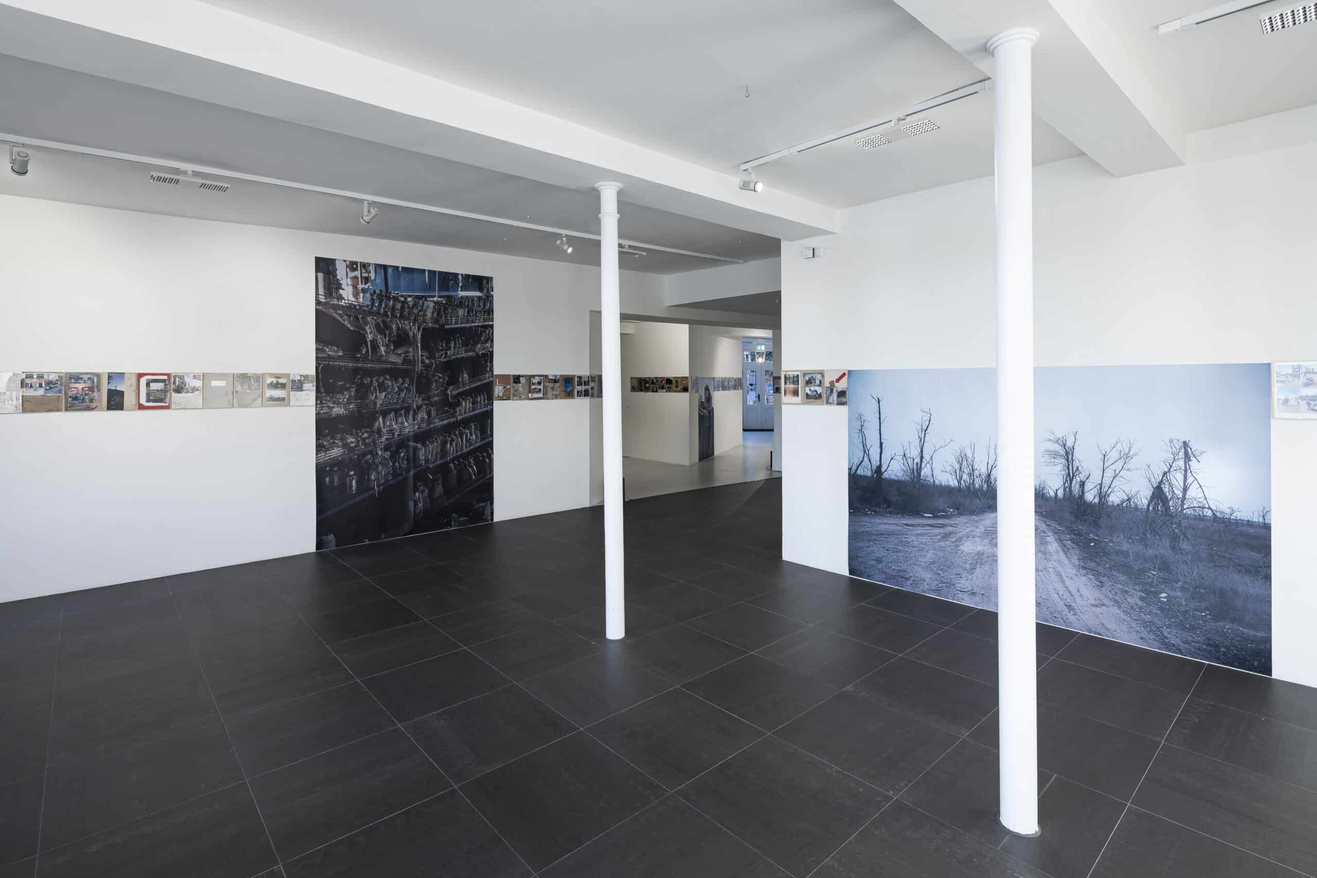 Вперше «Без назви» була показана у зовсім не виставковому просторі — київському бізнес-центрі «ЛУВР» — будівлі, що постраждала внаслідок ракетної атаки по об’єкту поряд. Під час перегляду під ногами глядачів хрускотіли уламки скла, з винесених вибухом вікон у сіре бетонне приміщення задували холодні протяги вітру. Приміщення — бетонний каркас без ознак життя — надавало гротескному руху перформерів потойбічної трагічності. Вдруге дія відбувається у просторі галереї Stadtgalerie Künstlerhaus Lauenburg як частина виставки персонального проєкту Курмаза — серії колажів з фотографій, малюнків, знайдених об’єктів та текстів, що розповідають про особливості переживання війни в Україні, поєднані у просторі галереї з аудіальним твором Мар’яни Клочко.